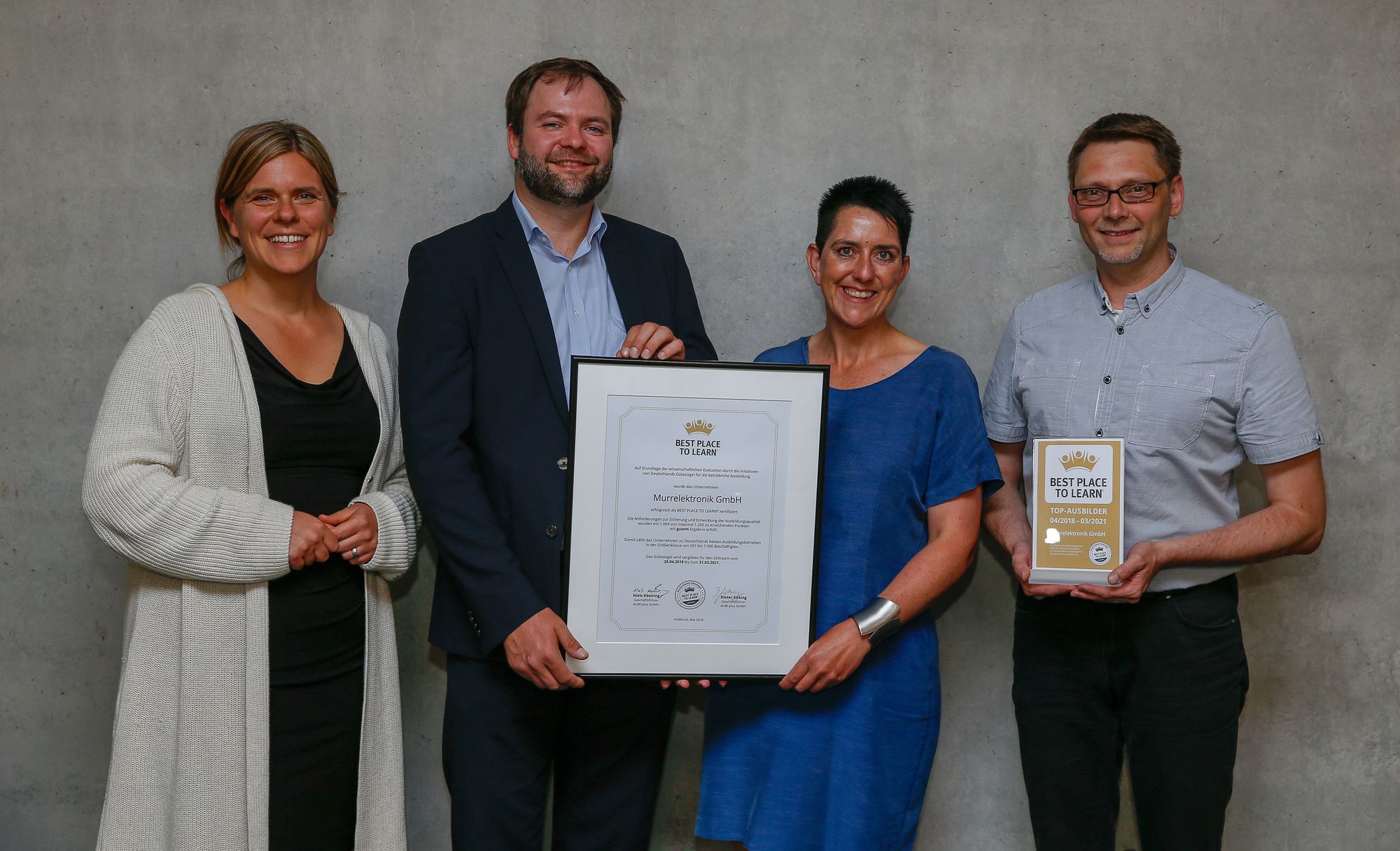 At Murrelektronik, our apprentices and trainees receive exceptional educations. For the second time in a row, Murrelektronik has been distinguished with the Best Place to Learn award. The family-owned company from Oppenweiler has been awarded the certificate for offering young professionals an especially valuable educational experience. Murrelektronik is proud that the certification involved both current and former trainees in the evaluation. The certificate is awarded by AUBI-Plus, the training experts of the young professional recruiters AUBI-Plus.